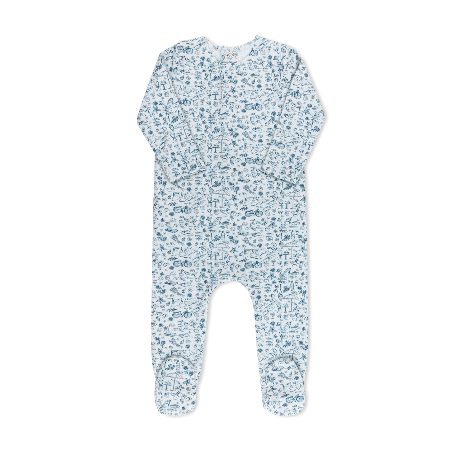 Fun summer print footie in soft Pima cotton, featuring a cheerful warm-weather motif that captures the joy of the season. Snap closures for easy dressing and a matching hat included with 3M and 6M sizes. Available in Blue and Pink.
